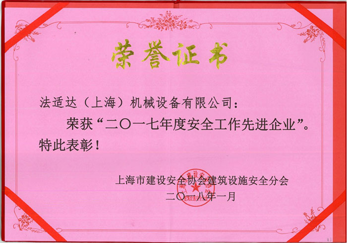 榮獲市“2017年度安全工作先進(jìn)企業(yè)” 時(shí) 間:2018-01-18 22:10:43 瀏覽次數(shù):7290 法適達(dá)榮獲由上海市建設(shè)安全協(xié)會(huì)建筑設(shè)施安全分會(huì)頒發(fā)的“2017年度安全工作先進(jìn)企業(yè)”。